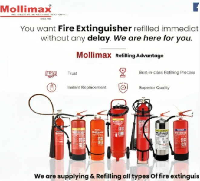 Fire Cylinders by Mollimax – Reliable Fire Safety Solutions Mollimax Fire Cylinders are designed to provide dependable and effective fire protection for residential, commercial, and industrial environments. Fire cylinders, commonly known as fire extinguishers, are the first line of defense during fire emergencies. Mollimax focuses on delivering high-quality fire cylinders that comply with safety standards and help minimize damage, protect lives, and control fire incidents at the earliest stage. Mollimax offers a wide range of fire cylinders suitable for different classes of fire, including ABC Dry Powder, CO₂, Water, and Foam fire cylinders. Each type is engineered to handle specific fire risks such as electrical fires, flammable liquids, combustible solids, and gas fires. The sturdy cylinder body, corrosion-resistant coating, and high-performance discharge mechanism ensure long service life and reliable operation when it matters most. All Mollimax fire cylinders are easy to operate, clearly labeled, and designed for quick response during emergencies. They are ideal for offices, factories, warehouses, hospitals, schools, shopping complexes, hotels, and residential buildings. Regular inspection, refilling, and maintenance services are also provided by Mollimax to ensure every fire cylinder remains fully functional and compliant with fire safety regulations. Mollimax emphasizes safety, quality, and customer satisfaction. Each fire cylinder undergoes strict quality checks before delivery, ensuring consistent performance and reliability. With expert guidance on fire safety planning and proper placement of fire cylinders, Mollimax helps organizations create safer environments and meet statutory fire safety requirements. Choosing Mollimax Fire Cylinders means investing in trusted fire protection solutions backed by professional support and timely service. Whether for new installations or replacement of existing equipment, Mollimax delivers complete fire safety solutions you can rely on to protect people, property, and assets.